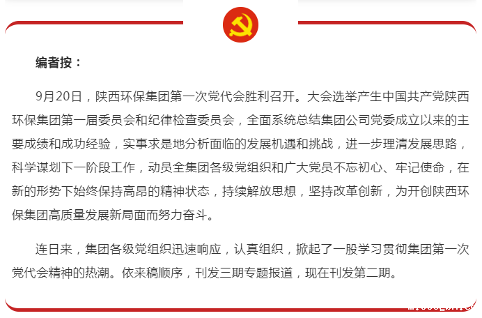 9月22日,秦枫公司召开专题会议认真传达学习贯彻集团第一次党代会精神,并对学习、宣传、贯彻党代会精神作出部署,掀起了认真学习贯彻集团第一次党代会精神的热潮。