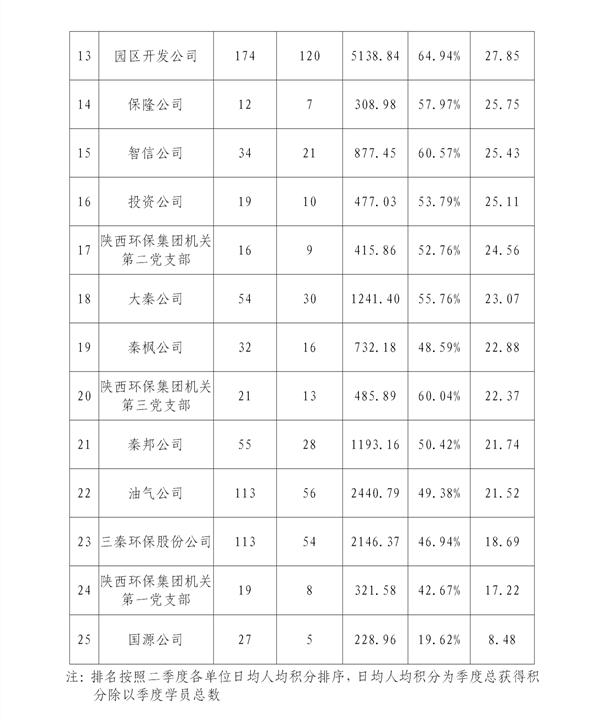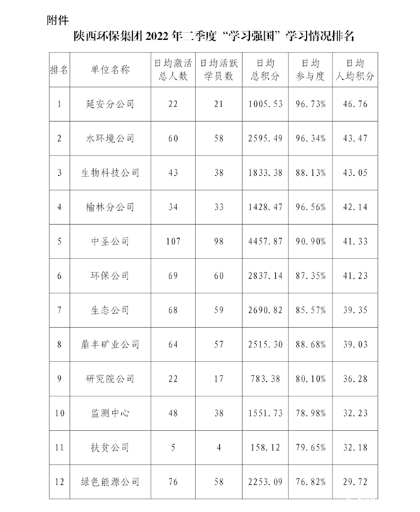二季度,kaiyun彩票官网整体平均参与度为69.34%,日均人均积分30.37分,日均活跃学员数914人。从学习情况统计来看,大部分党员学习积极性较强,整体参与度有所提高,排名靠前的单位要进一步巩固提升,再接再厉,持续发挥示范引领作用。但仍有部分排名长期较后的单位对“学习强国”平台重视程度不够,对党员的学习督促管理失之于松,国源公司、集团公司机关相关党支部、三秦环保股份公司的党员学习参与度较低,学习积极性不高,日均学习积分偏低,低分人数较多。希望排名靠后的单位要切实提高政治站位,将“学习强国”平台学用工作作为加强党内政治理论学习、基层党员培训的重要举措,持续深入推动学用管理工作,努力营造“比、学、赶、超”的浓厚学习氛围。